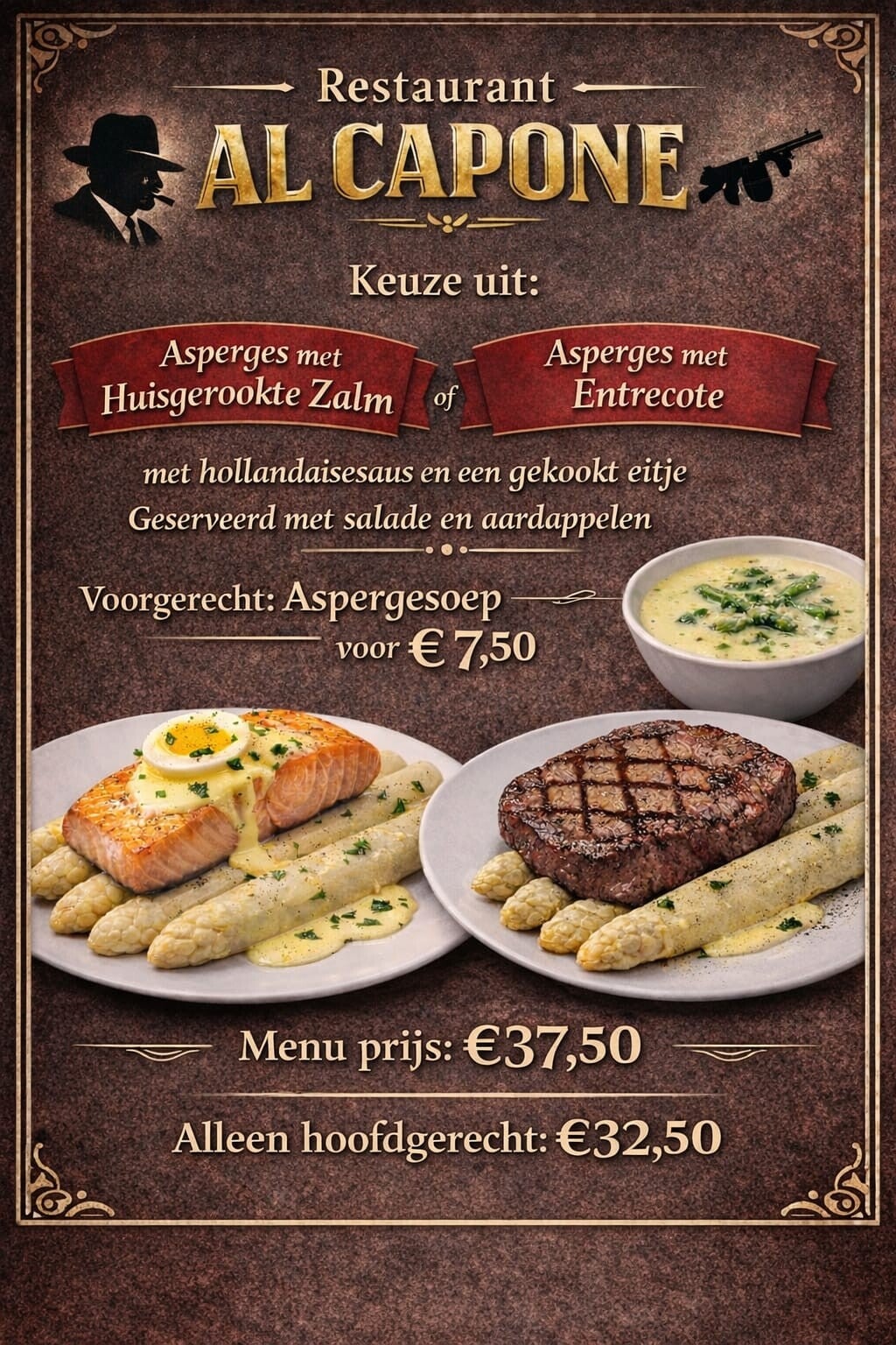Geniet van een malse steak van de grill of een dagverse vis die smelt op je tong. Elk gerecht wordt met de beste ingrediënten samengesteld en met liefde voor het vak geserveerd. Of je nu kiest voor een sappige entrecote of een gegrilde zalmfilet – bij Al Capone vind je altijd iets dat bij je smaak past.